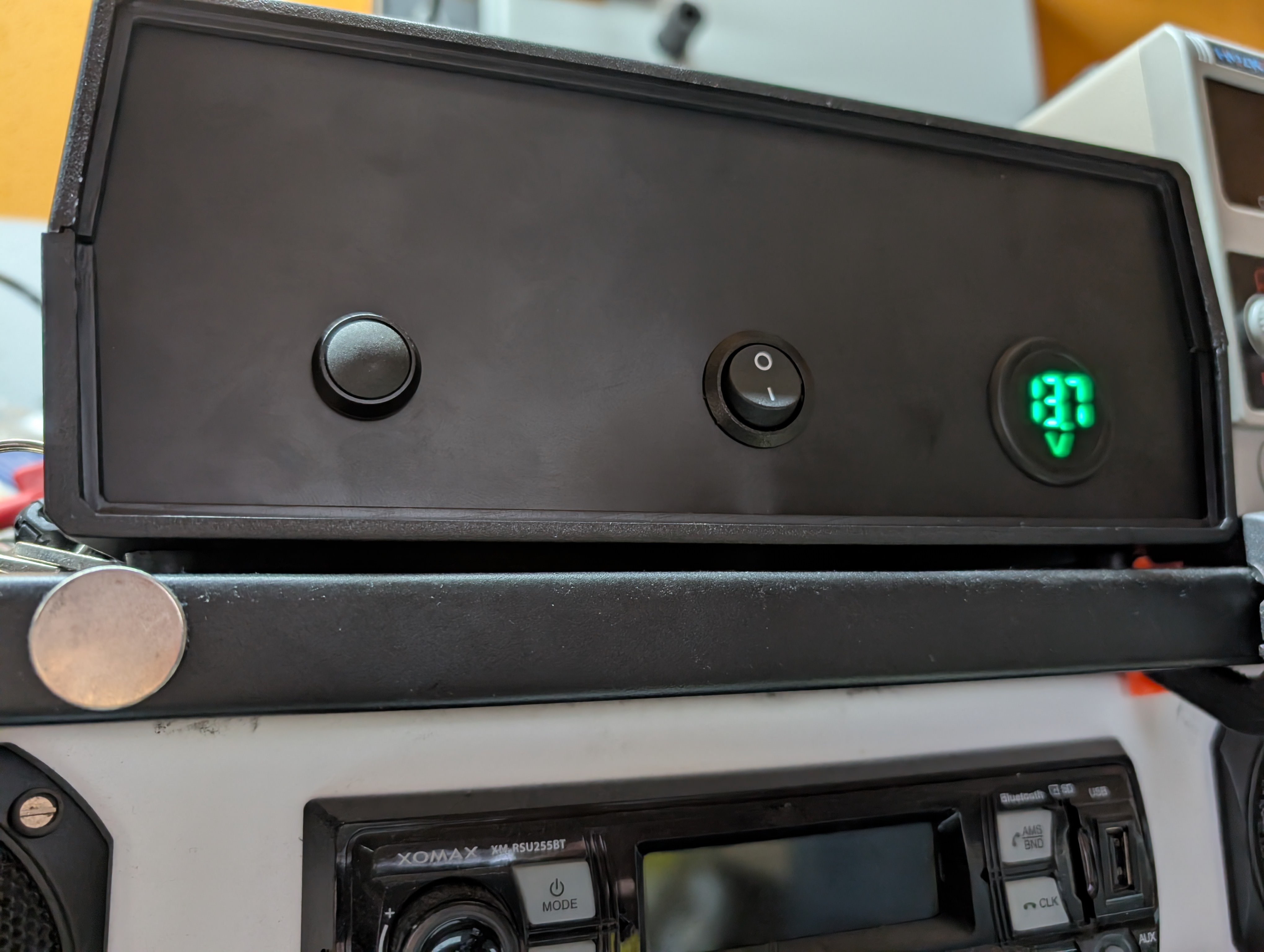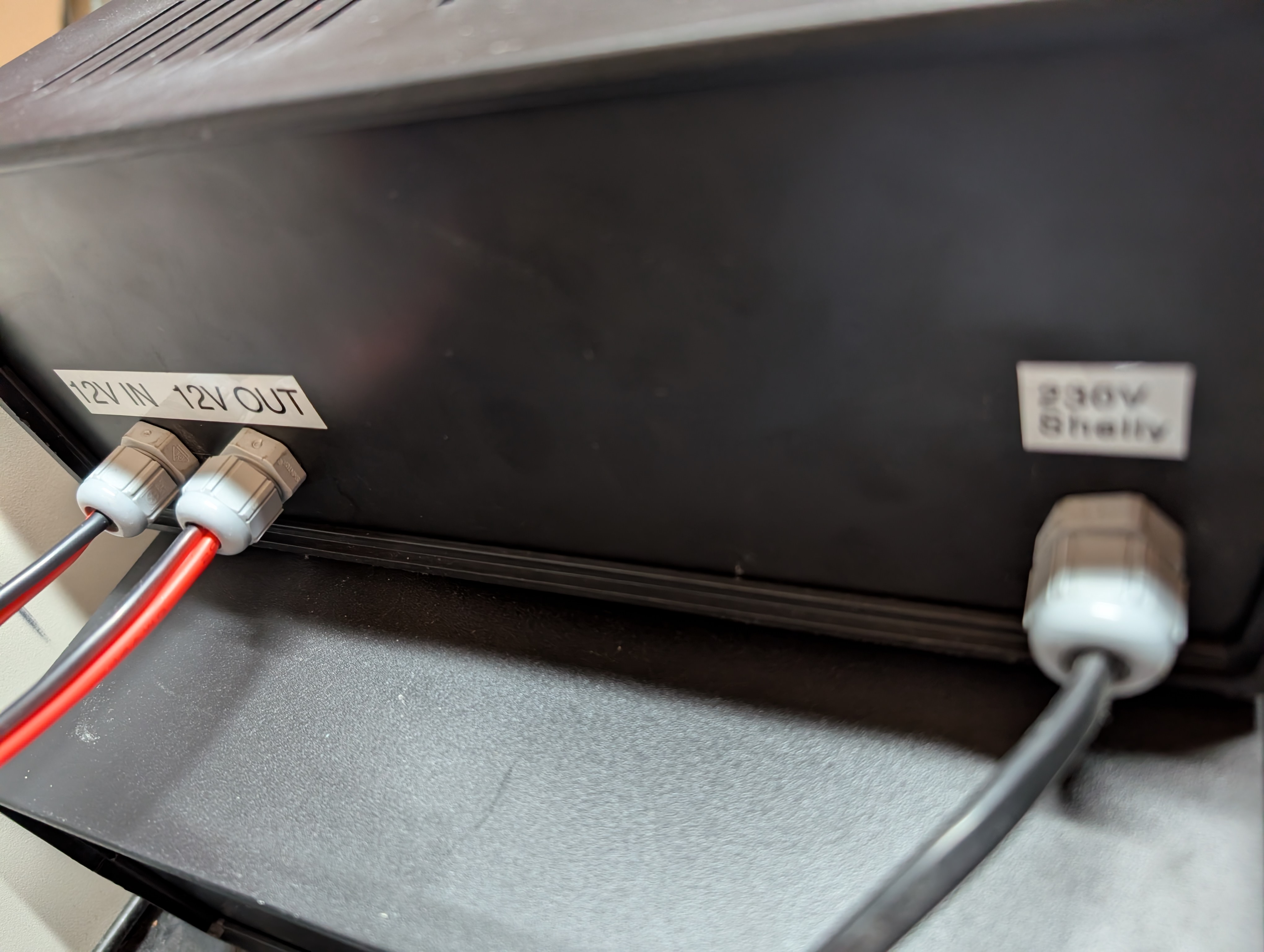 Zusaetzlich wurde ein Taster am Shelly gesetzt um diesen auch ohne App oder Sprachbefehl schalten zu koennen und zum Schluss: eine Spannungsanzeige die bei eingeschaltetem Ausgang (aktives Trennrelais) ueber die Akkuspannung informiert und als Betriebsanzeige dient.