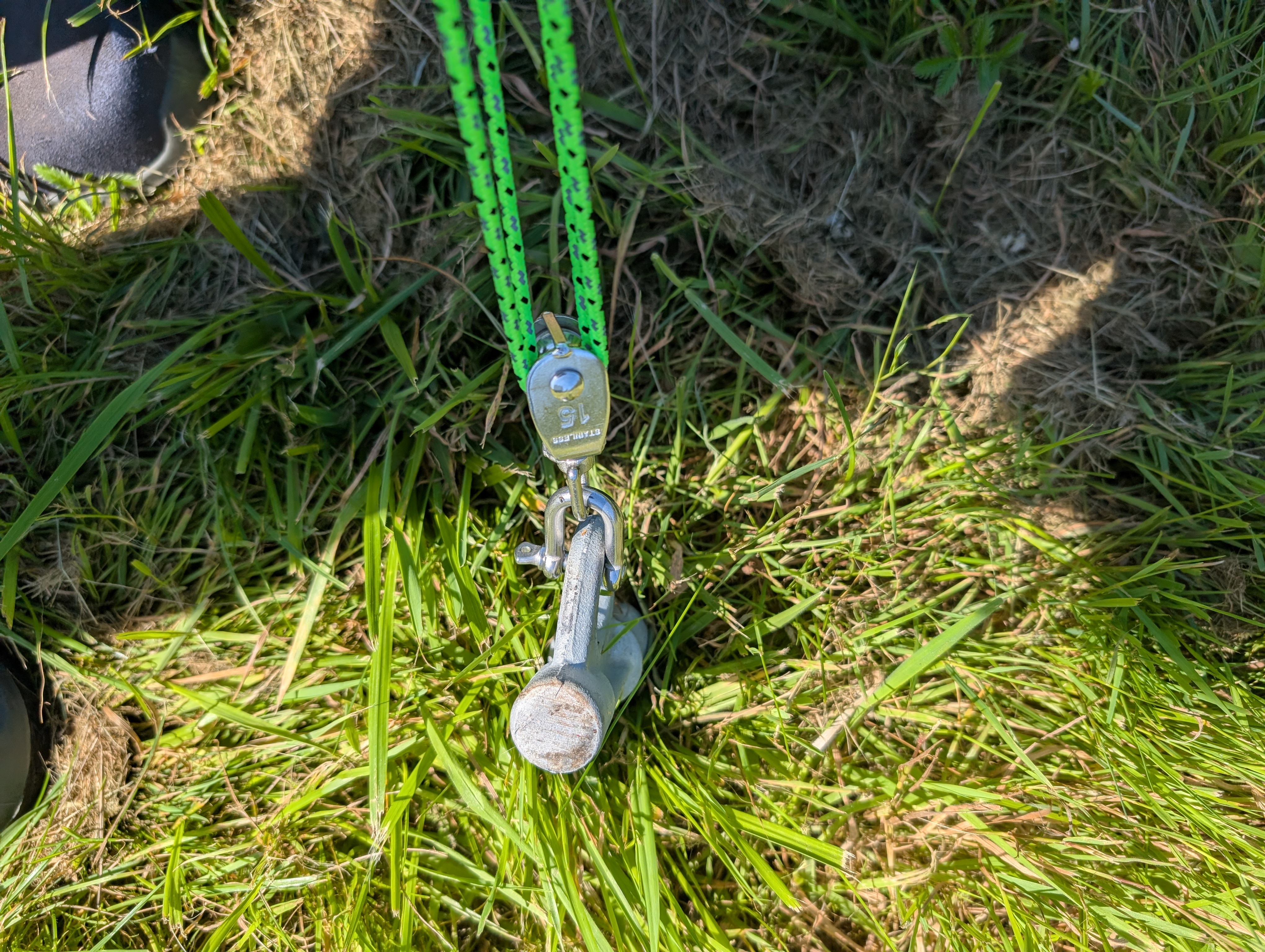 Zusaetzlich kamen noch ein Schaekel und eine Umlenkrolle zum Einsatz um die Abspannleine dadurch zu fuehren: